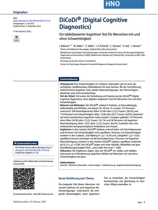Die wissenschaftliche Qualität von DiCoDi® wurde kürzlich in einer neuen, peer-reviewten Fachpublikation im Journal HNO aus dem Springer-Nature-Verlag weiter untermauert. In der 2026 veröffentlichten Studie untersuchten die Autorinnen und Autoren die diagnostische Güte des Verfahrens bei Erwachsenen mit und ohne kognitive Auffälligkeiten. Berichtet werden dabei eine gute diagnostische Genauigkeit, eine hohe Zuverlässigkeit der Messungen sowie eine überzeugende Fähigkeit, unterschiedliche Leistungsniveaus zuverlässig voneinander zu unterscheiden.
